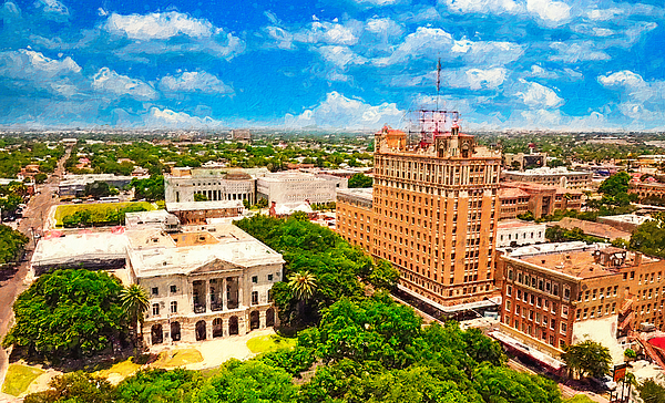 Aerial of Laredo, Texas – digital painting made from a photo where I made some small edits and I added painting texture. In the image can be seen the building of the United States Postal Service, some flats on Matamoros Street, while in the distance is the US District Court building. Laredo is a city in and the county seat of Webb County, Texas.