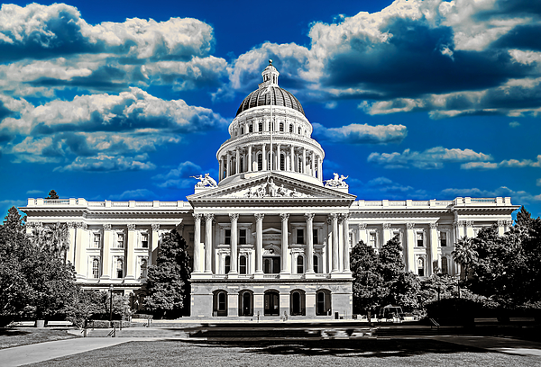 California State Capitol in Sacramento - Black and white, where I created a dramatic blue sky isolated. The California State Capitol, located in Sacramento, is the seat of the Californian government. The building was designed by Reuben S. Clark, and completed between 1861 and 1874 in neoclassical style. Sacramento is the capital city of the U.S. state of California and the seat and largest city of Sacramento County.