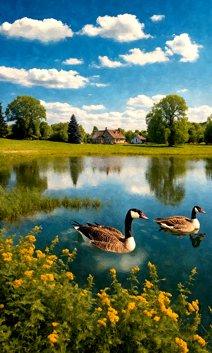 Canadian geese on a pond under a blue sky - digital painting made from a photo where I made some AI inpainting, edited the result, and at the end I added painting texture. This painting depicts a serene scene of two geese swimming in a reflective pond, surrounded by lush greenery and bright yellow flowers. The water mirrors the vibrant foliage and the geese, adding depth to the composition. Above, a blue sky filled with fluffy clouds stretches across the canvas, enhancing the peaceful atmosphere. In the background, a charming house is visible near the water's edge, nestled among the trees. The overall effect is a harmonious blend of nature and tranquility, creating a captivating visual experience.