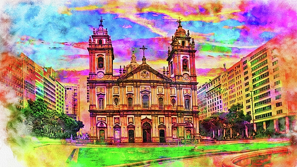 Candelária Church, or Igreja da Candelária, in Rio de Janeiro – digital painting made from a photo where I made some small edits and I added pen and watercolor painting texture. The Candelária Church, a significant Roman Catholic landmark in Rio de Janeiro, Brazil, underwent construction and adornment spanning from 1775 to the late 1800s. Blending Portuguese colonial Baroque architecture on its façade with subsequent Neoclassical and Neo-Renaissance interior elements, it stands as a testament to different architectural styles across centuries.