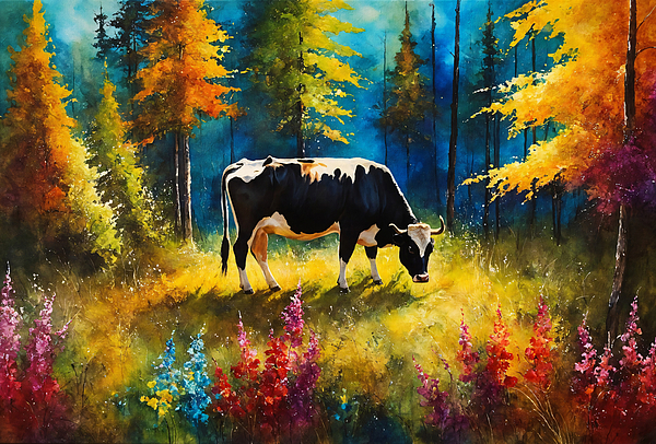 Cow grazing in a colorful forest – digital painting made from a photo where I made some AI inpainting, edited the result, and at the end I added painting texture. The painting depicts a serene and peaceful scene of a cow grazing in a vibrant forest, surrounded by a kaleidoscope of colors from the trees and flowers. The use of bold, contrasting colors creates a striking visual effect, drawing the viewer's attention to the cow as the central figure. The forest setting, with its lush greenery and varied flora, adds a sense of vitality and energy to the atmosphere. The overall mood of the painting is one of tranquility and calmness, evoking a sense of stillness and contemplation. The cow, in its natural habitat, seems to embody a sense of contentment and happiness.