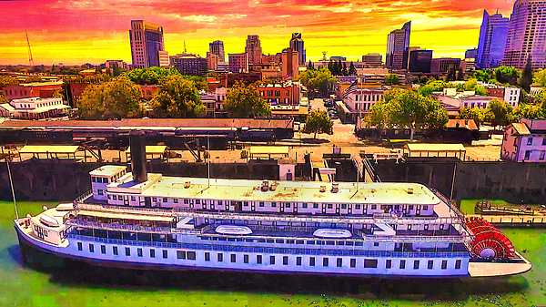 Delta King steamboat and the Sacramento skyline at sunrise – digital painting made from a photo where I added watercolor painting texture. Sacramento is the capital city of the U.S. state of California and the seat and largest city of Sacramento County. Delta King steamboat at sunrise on the Sacramento River - digital painting made from a photo where I added painting texture. In the image can be seen Delta King Hotel, and in the background is the skyline of Downtown Sacramento. Delta King is a 285-foot-long sternwheel steamboat built between 1924 and 1927. Today, Delta King is permanently moored in Sacramento, California, and is home to a 44-room hotel.