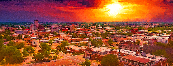 Downtown Waco, Texas, at sunset – digital painting made from a photo where I made some small edits and I added painting texture. Waco is a city located along the Brazos River in McLennan County, Texas. Downtown Waco is relatively small when compared to other larger Texas cities. The 22-story ALICO Building, the tallest building in Waco, can be seen in the distance, while in the foreground can be seen the Columbus Avenue Baptist Church.