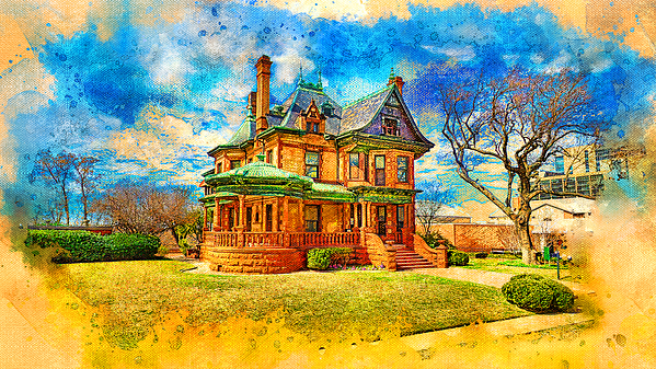 Eddleman–McFarland House in Fort Worth, Texas – digital painting made from a photo where I made some small edits and I added painting texture. Sometimes known as the Ball–Eddleman–McFarland House or just the McFarland House, this historic residence was built in 1899 in the Quality Hill section of Fort Worth. The exterior of the house is constructed of brick, sandstone, and marble in the Victorian and Queen Anne styles.
