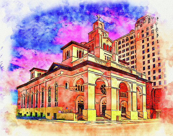 Gesu Church in Miami, Florida – digital painting made from a photo where I made some small edits and I added pen and watercolor painting texture. The Gesu Church is a historic Roman Catholic church in Miami, Florida, located at 118 Northeast 2nd Street. Built in 1896 in Mediterranean Revival Style, it is the oldest Catholic Church in Miami.