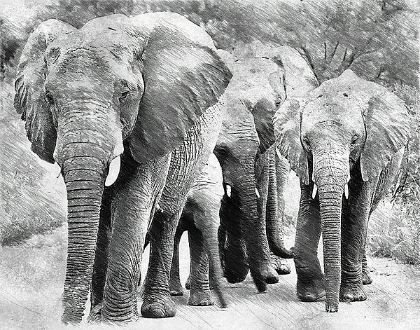 Group of elephants - digital painting made from a photo where I made some small edits and I added a pencil sketch effect. Elephants are the largest terrestrial animals, known for their imposing size and powerful presence. Their long trunks, large ears, and ivory tusks contribute to their unique and aesthetically pleasing appearance. Elephants hold deep cultural and spiritual significance in many societies. They are often associated with wisdom, strength, and longevity, making them important in various traditions.