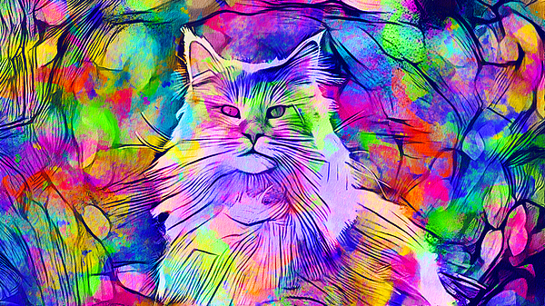 Maine Coon cat looking at camera – colorful lines digital painting made from a photo where I made some small edits and I added a colorful painting texture. The Maine Coon is a large domesticated cat breed, originated in the U.S. state of Maine, where it is the official state cat. The Maine Coon is a large and social cat, which could be the reason why it has a reputation of being referred to as "the gentle giant." They are known for being loyal to their family and cautious, but also relatively easy to train.