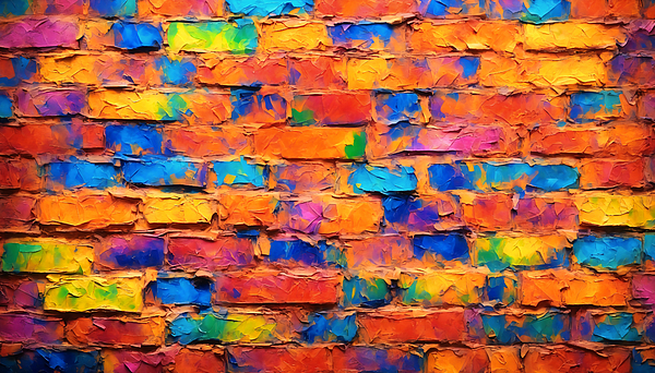 Painterly abstract brick wall in vibrant colors – digital painting made from a photo where I made some AI inpainting, edited the result, and at the end I added painting texture. The painting features a vibrant and dynamic abstract representation of a brick wall, with a mesmerizing arrangement of colorful bricks that seem to burst with energy. The chaotic yet captivating pattern of the bricks creates a sense of movement and creativity, drawing the viewer's attention to the rich, bold colors that blend together in a kaleidoscope of hues. The abstract style of the painting adds to its emotional impact, evoking feelings of liveliness and dynamism. The brick wall, often a symbol of structure and solidity, is transformed into a vibrant and expressive element that seems to pulse with life. The overall effect is one of unbridled creativity and energy, making the painting a standout piece.