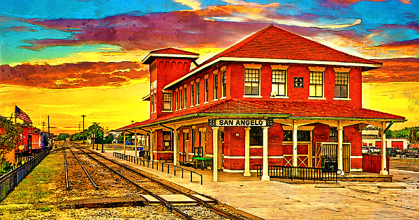 Railway Museum of San Angelo, Texas, at sunset – digital painting made from a photo where I made some small edits and I added painting texture. The Railway Museum is housed in a historic two story brick passenger depot built in 1910 as the Texas Corporate headquarters of The Kansas City, Mexico and Orient Railroad.