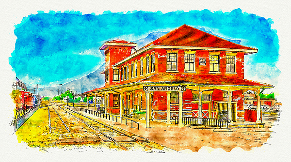 Railway Museum of San Angelo, Texas - digital painting made from a photo where I made some small edits and I added pen sketch and watercolor painting texture. The Railway Museum is housed in a historic two story brick passenger depot built in 1910 as the Texas Corporate headquarters of The Kansas City, Mexico and Orient Railroad.