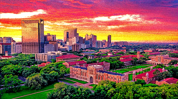 Rice University campus with the Texas Medical Center seen in the distance at sunset, in Houston - digital painting made from a photo where I made some small edits and I added a pencil sketch effect. Rice University (William Marsh Rice University) is a private research university in Houston, Texas. In the foreground can be seen the Lovett Hall, formerly known as the Administration Building, and the institute's first building, built in 1911. In the distance can be seen the Texas Medical Center, a dense agglomeration of hospitals, schools, and ancillary businesses.