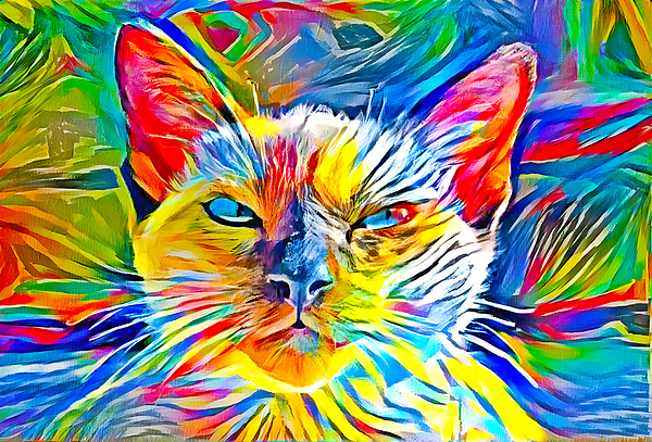 Siamese cat face in the sun - digital painting made from a photo where I made some small edits and I added a colorful zebra painting texture. The Siamese cat is one of the first distinctly recognized breeds of Asian cat. A Siamese cat is characterized by blue almond-shaped eyes, a triangular head shape, and large ears. It has an elongated, slender, and muscular body, and various forms of point colouration. Siamese are usually very affectionate and intelligent cats, renowned for their social nature. Many enjoy being with people and are sometimes described as "extroverts".