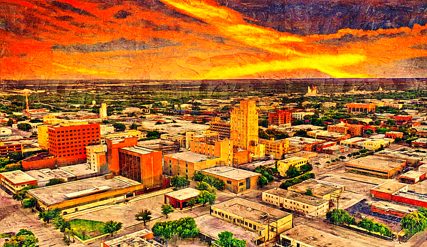 Skyline of downtown Abilene, Texas, at sunset – digital painting made from a photo where I made some small edits and I added painting texture. In the image can be seen the city of Abilene at sunset with Hotel Wooten, First Financial Center, The Windsor, Prosperity Bank Building, United Centre, and Alexander Building. Abilene is the county seat of Taylor County and the 27th-most populous city in the state of Texas.