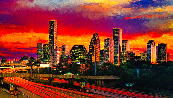 Skyline of downtown Houston, Texas, in the evening – digital painting made from a photo where I made some small edits and I added painting texture. In this image can be seen downtown Houston from the Interstate 45 Fwy HOV, with its main skyscrapers: JPMorgan Chase Tower, Wells Fargo Bank Plaza, Williams Tower, TC Energy Center, and many other. Houston is located in Southeast Texas near Galveston Bay and the Gulf of Mexico, and it is the seat of Harris County. Houston is the most populous city of the state of Texas, and had the fifth-tallest skyline in North America.