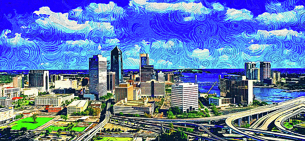Skyline of downtown Jacksonville, Florida – digital painting made from a photo where I made some small edits and I added impressionist painting texture. Here can be seen the St Johns River crossed by the Acosta bridge, and the main skyscrapers of downtown Jacksonville including the Bank of America Tower, the Wells Fargo Center, TIAA Bank Center, the VyStar Tower, and many more. On the other side of the river can be seen The Peninsula at St. Johns Center and the Riverplace Tower. Jacksonville is a city located on the Atlantic coast of Florida, the most populous city in the state, and the seat of Duval County.