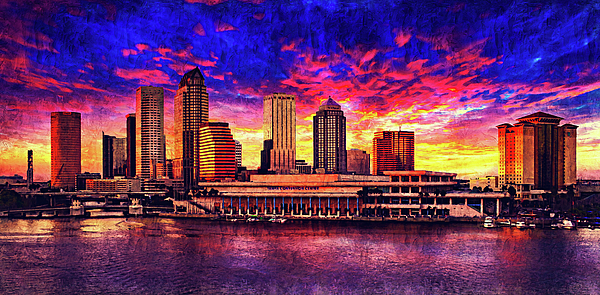 Skyline of Downtown Tampa, Florida, at sunset - digital painting made from a photo where I made some small edits and I added impasto oil painting texture. Here can be seen the panorama of Tampa with the main skyscrapers, including the Rivergate Tower, Bank of America Plaza, Wells Fargo Center, Tampa Marriott Waterside, Truist Place, and the Tampa Convention Center. Tampa is a major city on the Gulf Coast of the U.S. state of Florida. Tampa is the largest city in the Tampa Bay area and the seat of Hillsborough County.