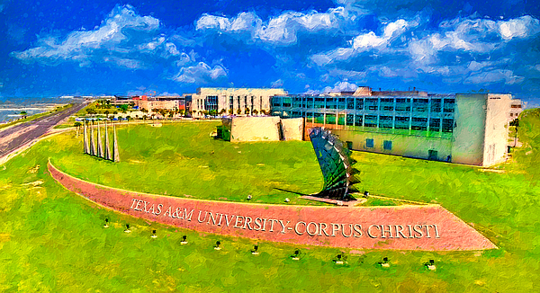 Texas A&M University-Corpus Christi – digital painting made from a photo where I made some small edits and I added painting texture. Texas A&M University–Corpus Christi is a public research university in Corpus Christi, Texas, opened in 1947. Here can be seen the entrance and the Harte Research Institute for Gulf of Mexico Studies building.