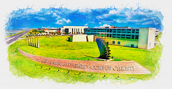 Texas A&M University-Corpus Christi - digital painting made from a photo where I made some small edits and I added watercolor painting texture. Texas A&M University–Corpus Christi is a public research university in Corpus Christi, Texas, opened in 1947. Here can be seen the entrance and the Harte Research Institute for Gulf of Mexico Studies building.