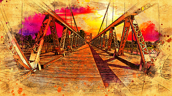 The deck of Waco Suspension Bridge at sunset – digital painting made from a photo where I made some small edits and I added painting texture with a vintage look. The Waco Suspension Bridge is a single-span suspension bridge which crosses the Brazos River in Waco, Texas. The bridge was opened in 1869, and in 1970 was listed on the National Register of Historic Places. The Waco Suspension Bridge connects the Indian Spring Park (on the southwest side of the river) with Doris D. Miller Park (on the northeast side of the river).