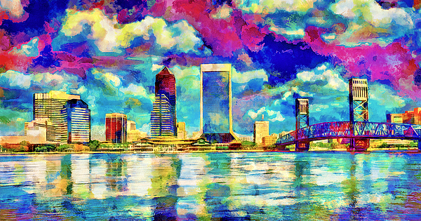 The waterfront of downtown Jacksonville, Florida – digital painting made from a photo where I made some small edits and I added colorful painting texture. Here can be seen the St Johns River crossed by the John T. Alsop Jr. Bridge, and the main skyscrapers of downtown Jacksonville including the Bank of America Tower, the Wells Fargo Center, One Enterprise Center, the VyStar Tower, and many more. Jacksonville is a city located on the Atlantic coast of Florida, the most populous city in the state, and the seat of Duval County.