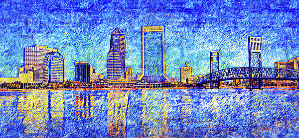 The waterfront of downtown Jacksonville, Florida – digital painting made from a photo where I made some small edits and I added painting texture. Here can be seen the St Johns River crossed by the John T. Alsop Jr. Bridge, and the main skyscrapers of downtown Jacksonville including the Bank of America Tower, the Wells Fargo Center, One Enterprise Center, the VyStar Tower, and many more. Jacksonville is a city located on the Atlantic coast of Florida, the most populous city in the state, and the seat of Duval County.